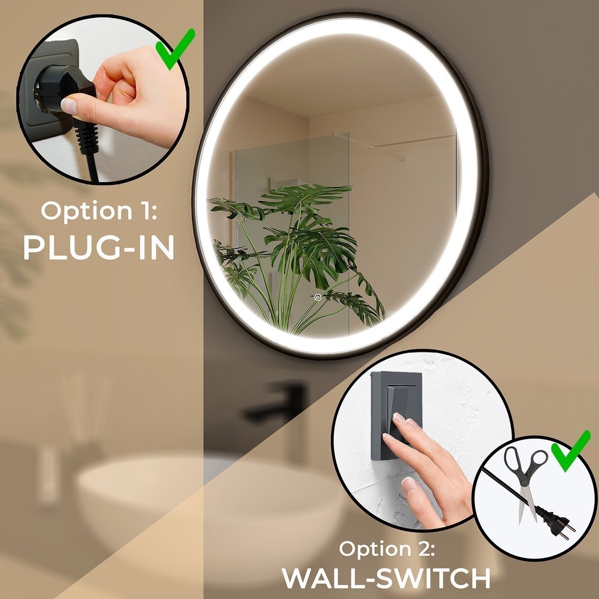 All bathroom mirrors come with a power cord with a molded plug. A mounting kit is provided for hanging the mirror.