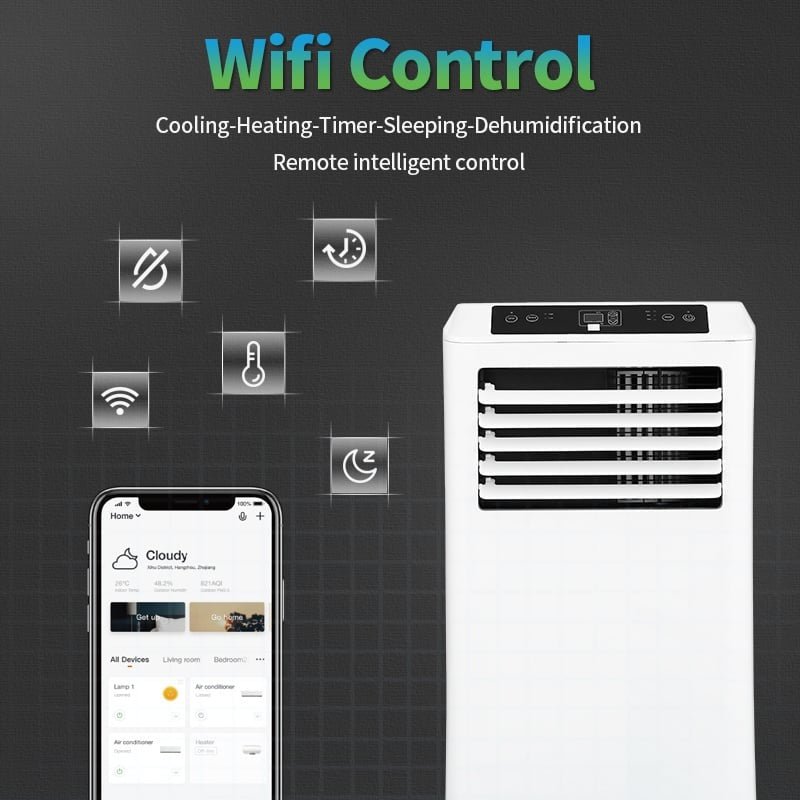 Le climatiseur mobile est facile à utiliser grâce au panneau de commande et à la télécommande sans fil fournie. Par exemple, la fonction de minuterie vous permet de régler un mode veille. Le tuyau d'évacuation de l'air froid vers l'extérieur, également fourni, a les dimensions suivantes : 150 cm de long et 14 cm de diamètre. Le climatiseur peut être déplacé grâce aux roulettes situées à la base.